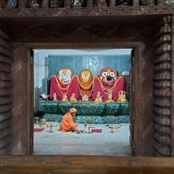 The grandeur of the procession includes mass and huge drum bits, holding up of chati taraas in addition to folk dance of Paikas. The dehury, the priest, holding the symbol of the deity on his shoulder, walks through out the procession of five kilometers along with a huge follower of devotees. When he reaches to the temple which is already surrounded by a large number of temporary stalls, put the sacred symbol on a ceremonial dais and starts puja for two days consecutively.